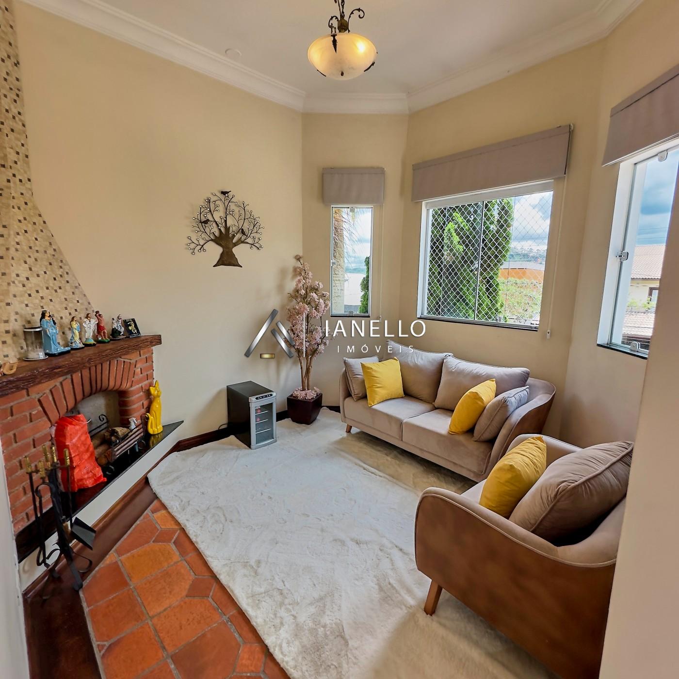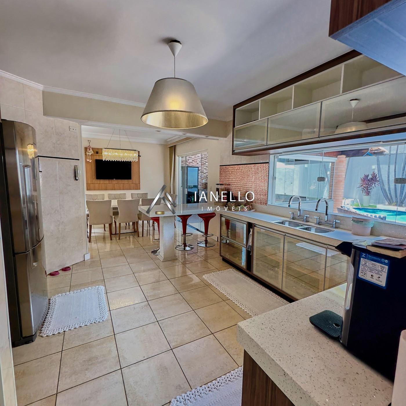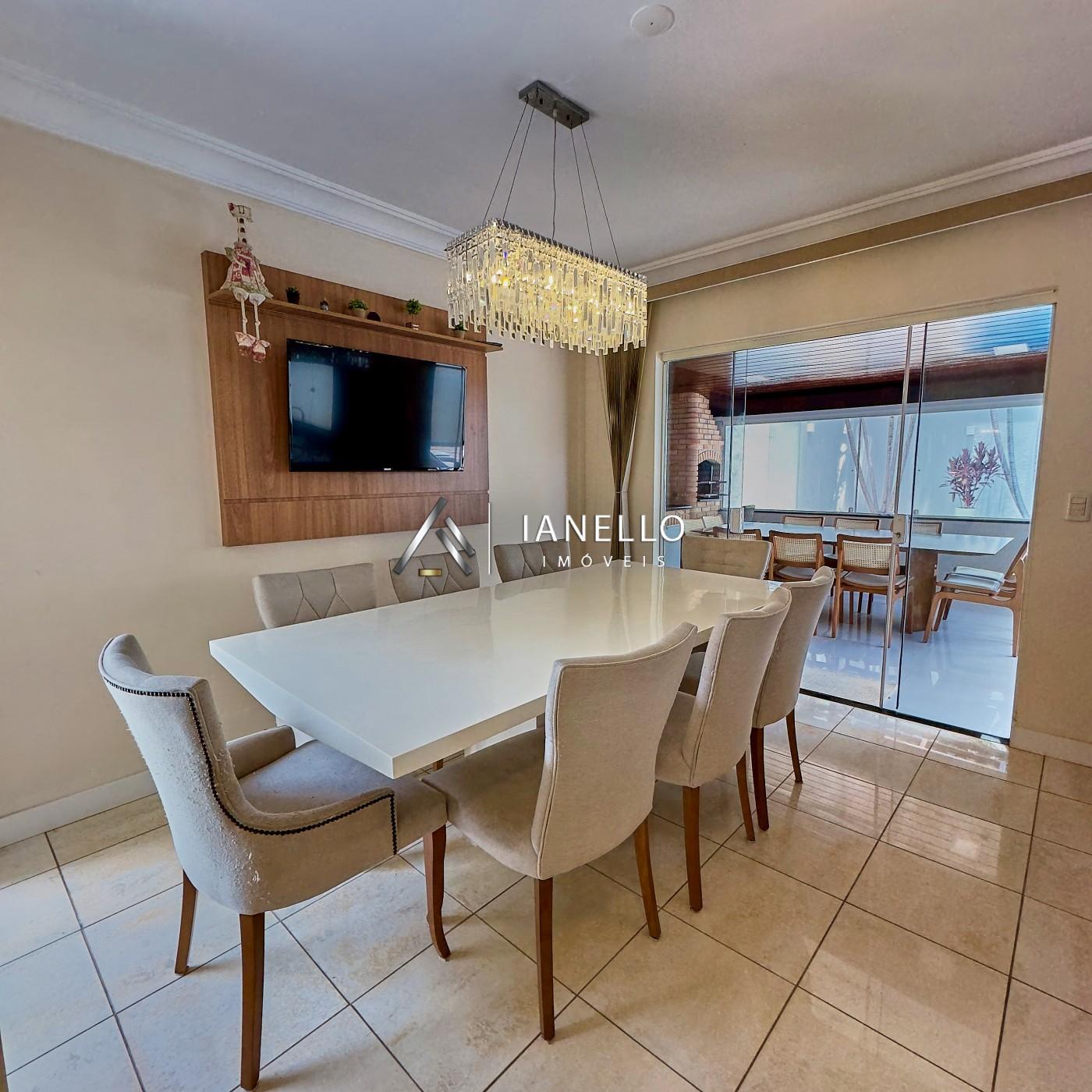 O living amplo e integrado conecta sala de estar, lareira e sala de TV, criando um ambiente acolhedor e elegante, ideal tanto para o dia a dia quanto para receber. A sala de jantar se integra à cozinha planejada, equipada com armários embutidos, unindo praticidade e sofisticação.