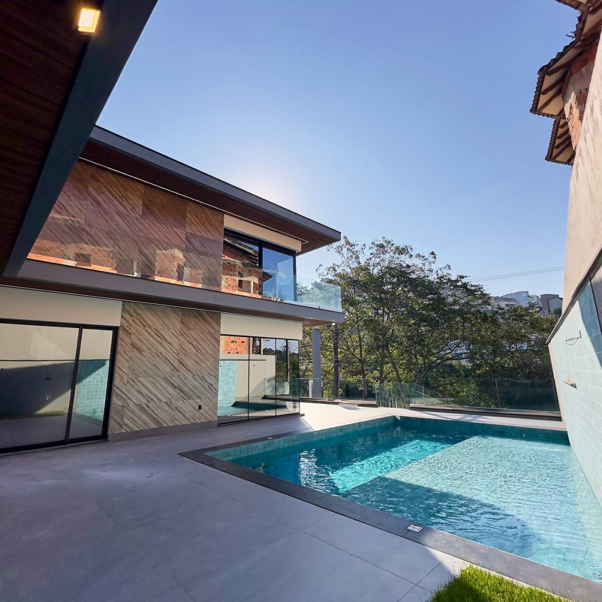 A área externa é um espetáculo à parte: uma piscina deslumbrante emoldurada por uma vista permanente para o lago com um lindo pôr do sol, cenário exclusivo para momentos memoráveis.